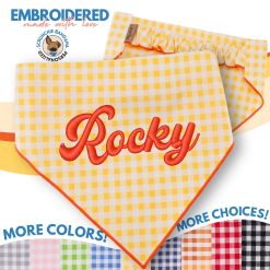 Custom Embroidered Plaid Dog Bandana – 20 Thread Colors, 6 Font Choices, 5 Fabric Patterns – Personalized Pet Scarf